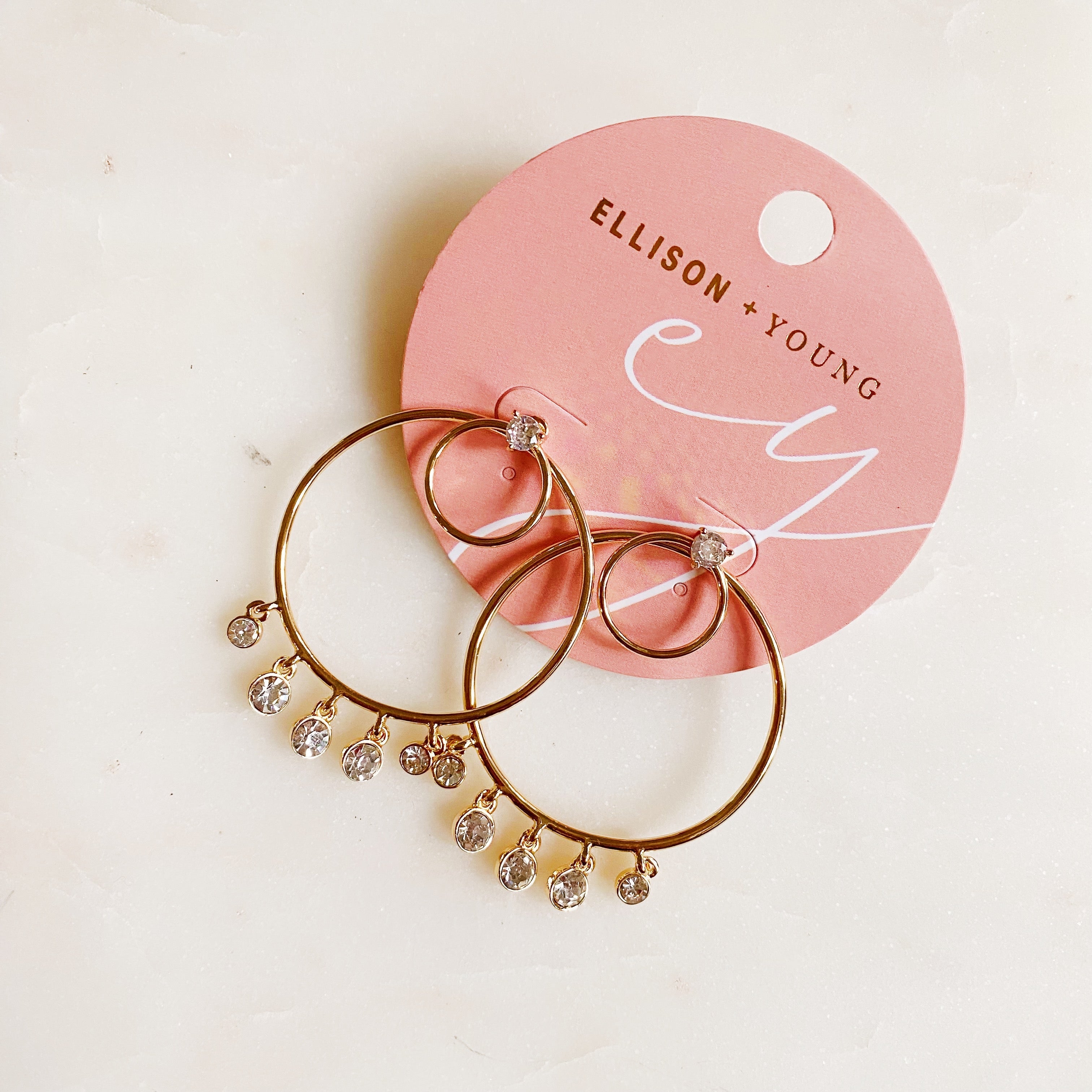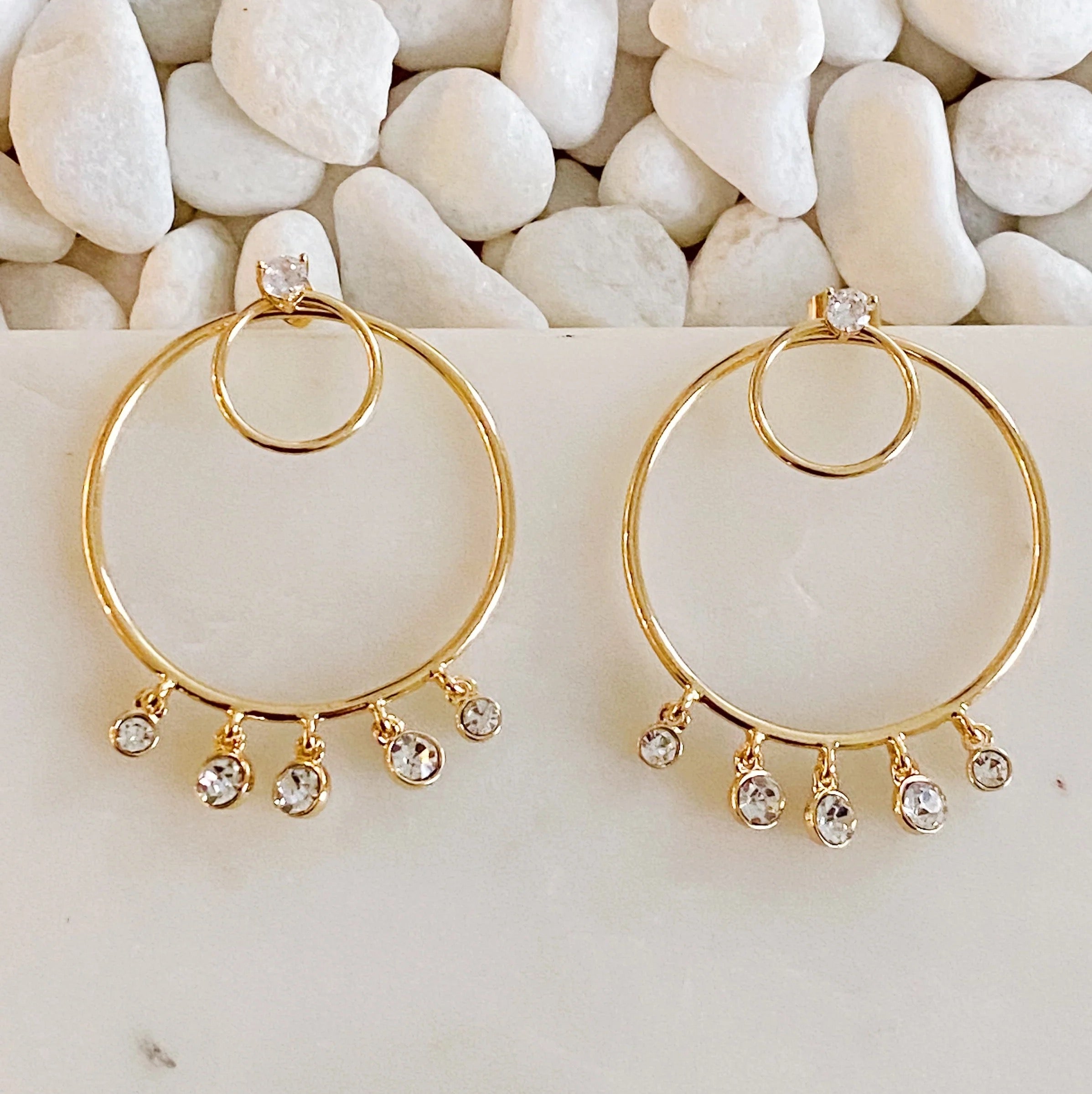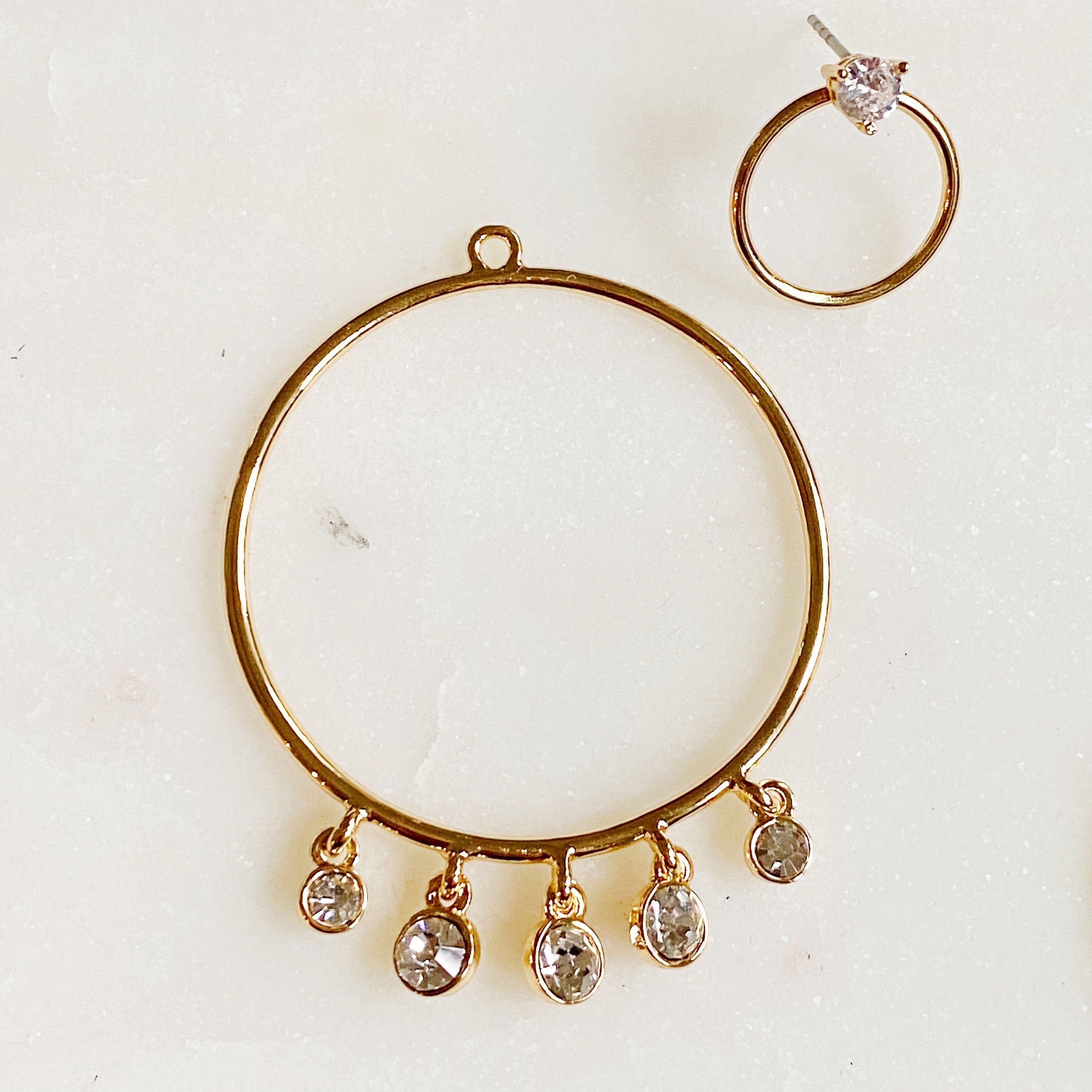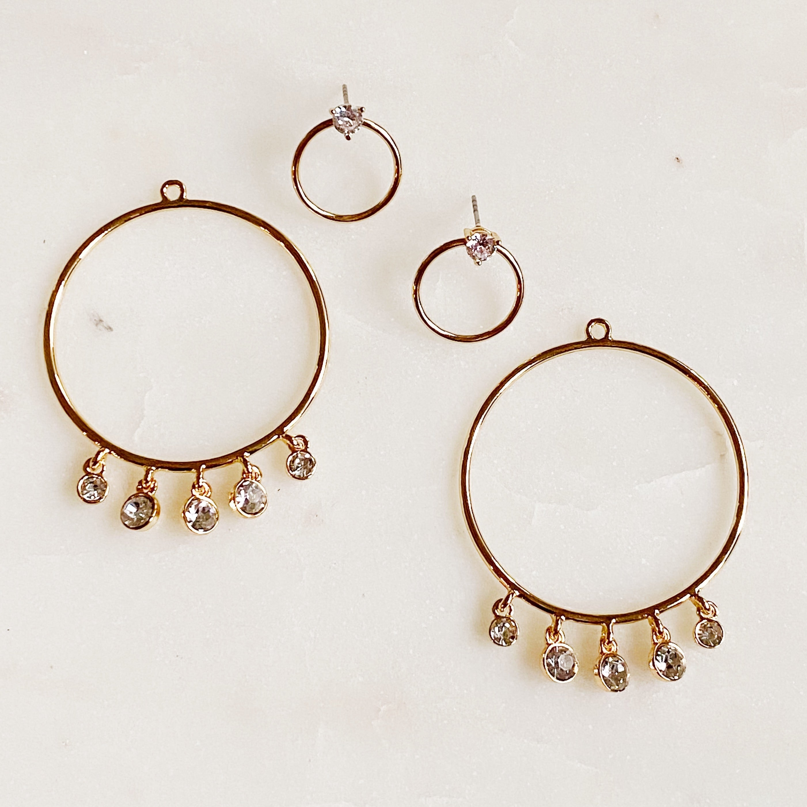 2 pieces of circled hoops put together front and the back to make this trendy style. Just right amount of shines are added to dangle. So fun to wear everyday and for any occasions.