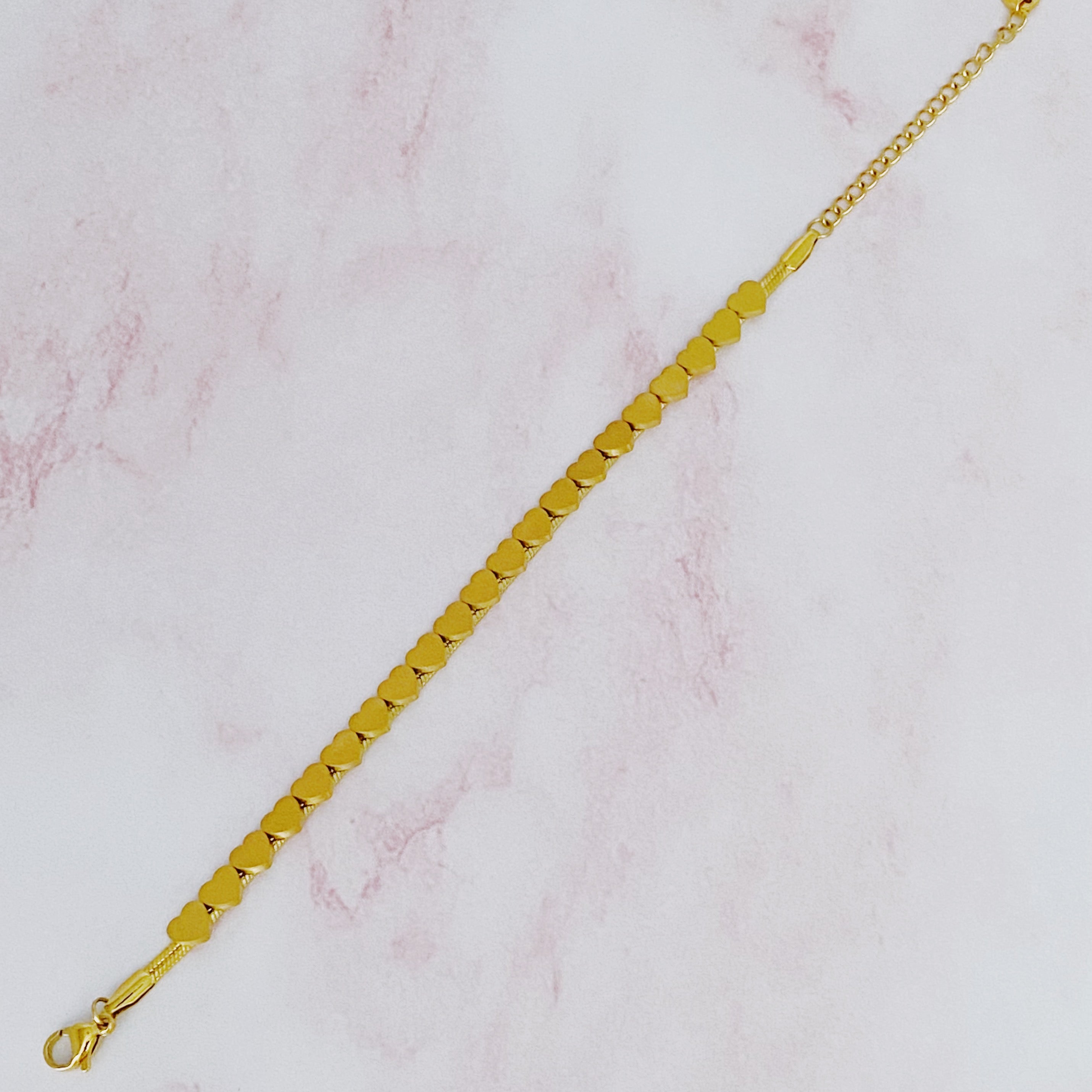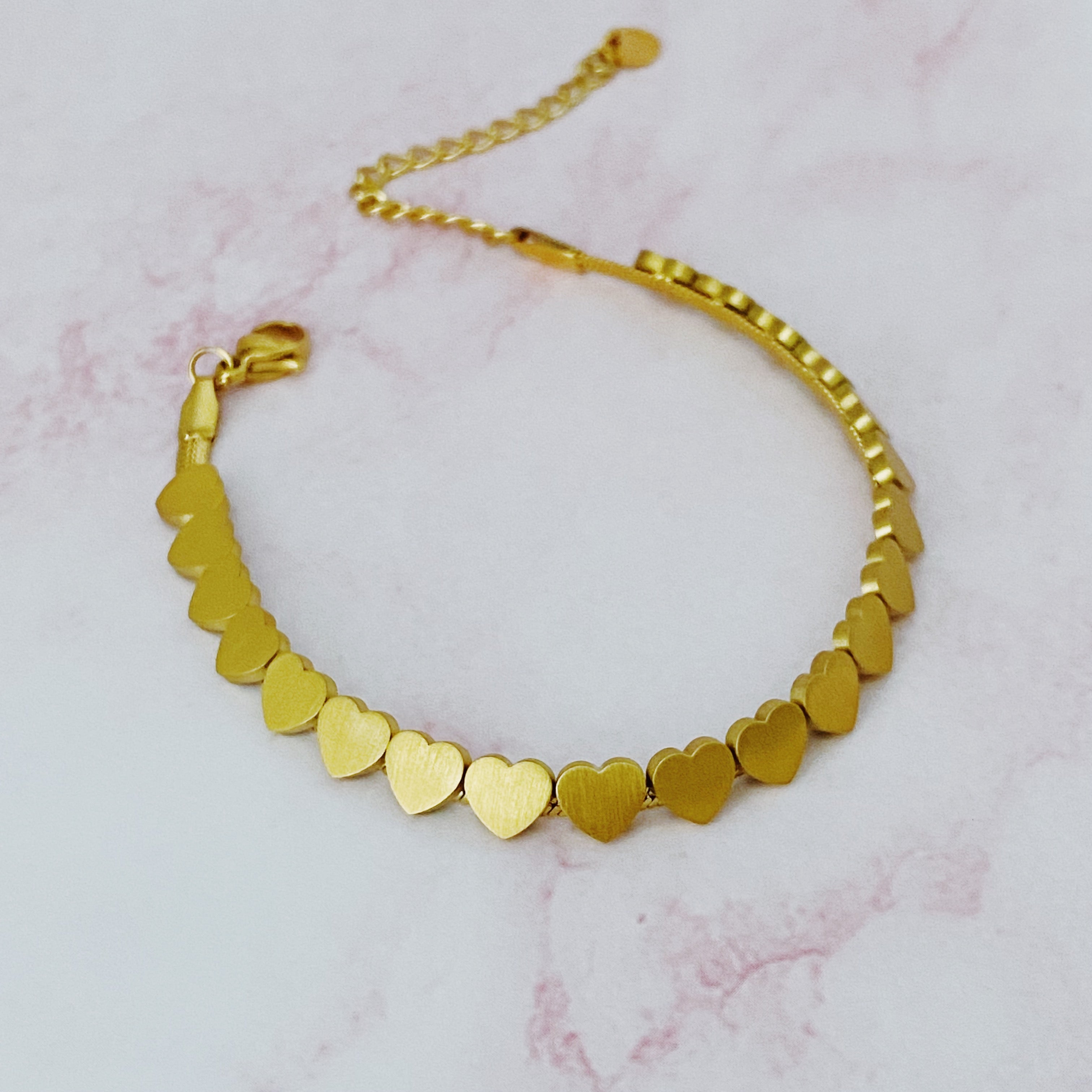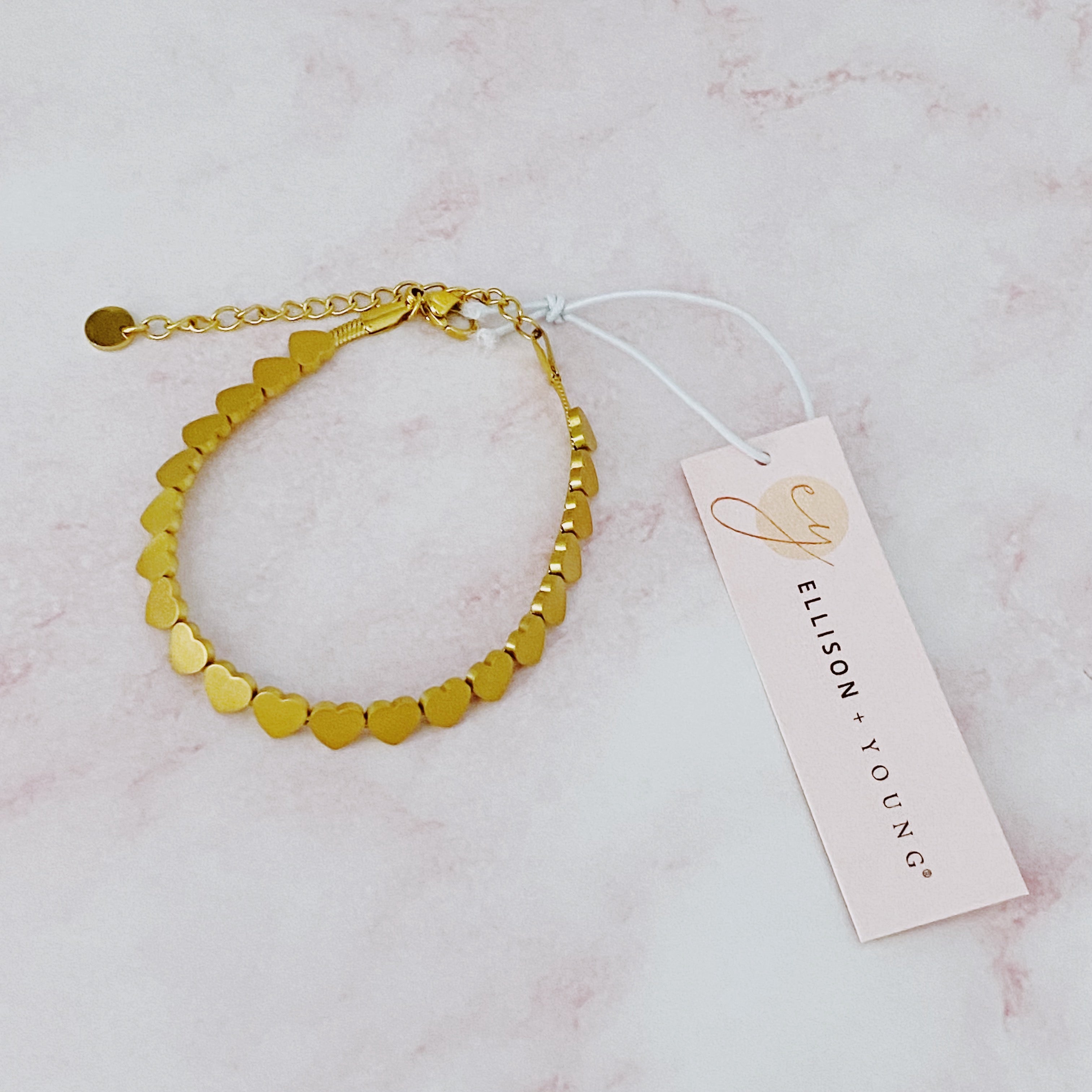 The small hearts are lovingly put together to create a bracelet that lays beautifully on the wrist. It's an elegant and timeless choice for completing a layered look.