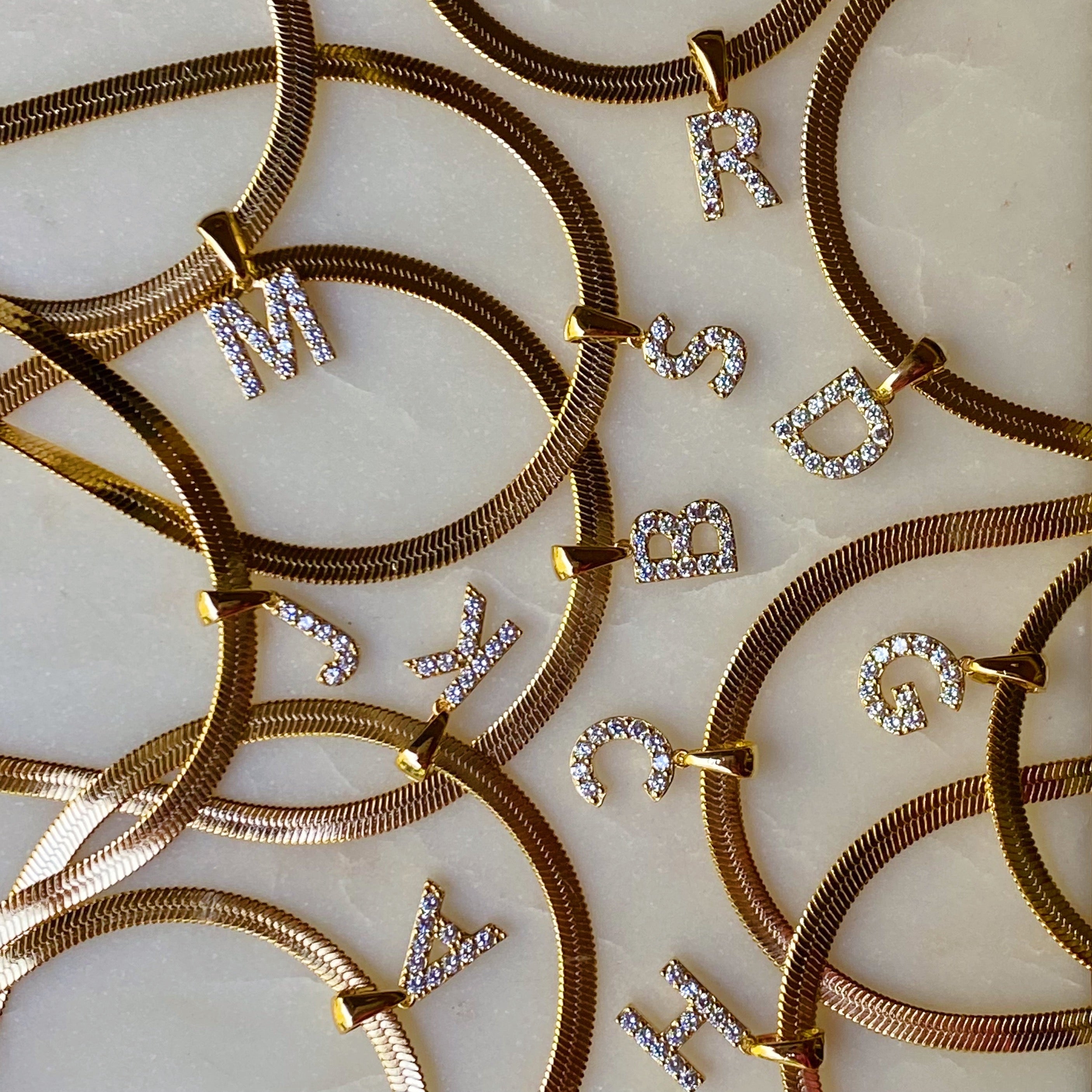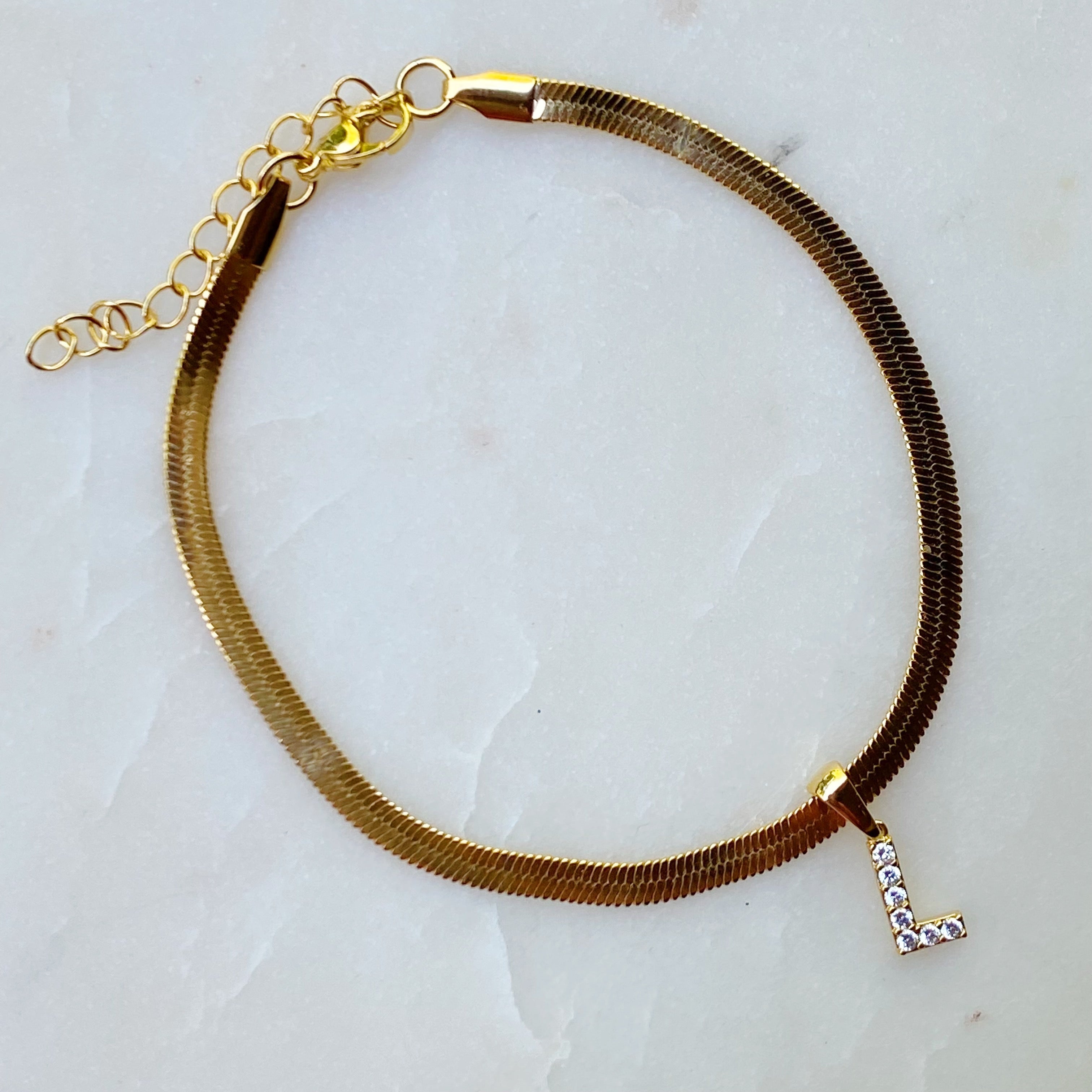 Herringbone chain anklet with shiny initial charm. Versatile to wear only chain since initial charm can be taken off from the chain.